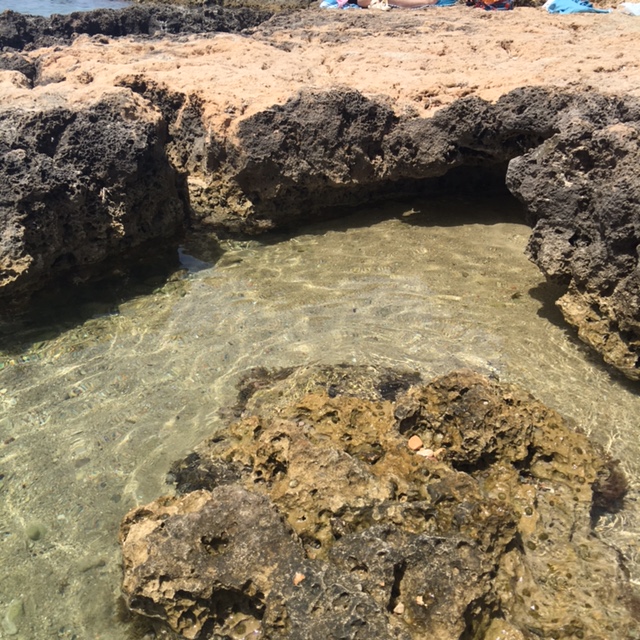 En quittant Palma, le long de la côte sud en se dirigeant vers l’Ouest et en s’éloignant un peu des plages surpeuplées (en arrière-plan sur la photo de droite), on trouve de mini criques où l’eau est transparente et où il y a juste de la place pour deux.