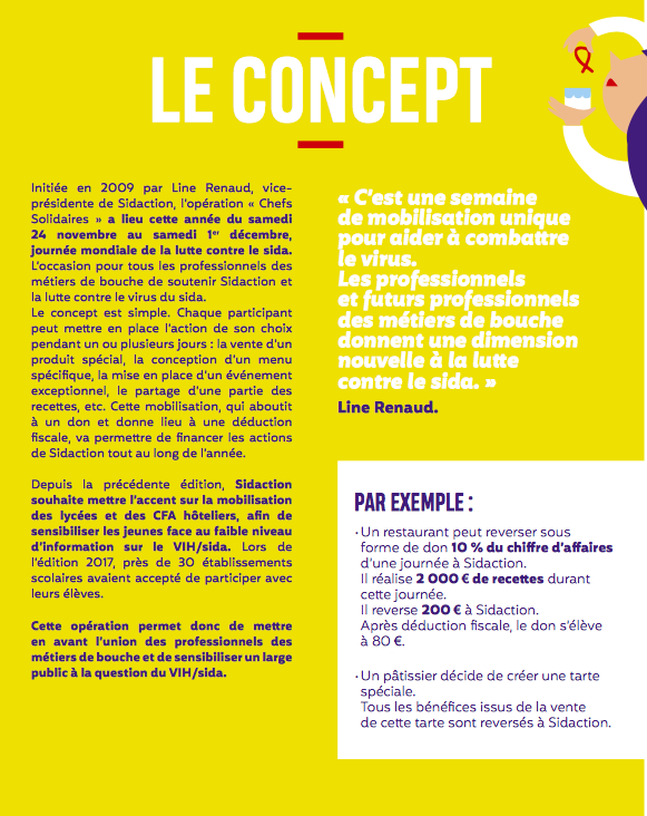 Depuis l’an dernier, Sidaction a souhaité mettre l’accent sur la mobilisation des lycées et des CFA hôteliers afin de sensibiliser les jeunes face au faible niveau d’information sur le VIH/sida. Cette année, de nombreux établissements scolaires ont accepté de participer avec leurs élèves.