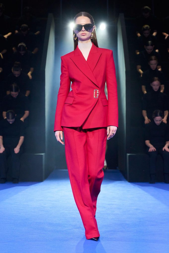 Les vêtements pour femmes comprennent des costumes écharpés et à double boutonnage avec de nouveaux boutons qui logo et des robes à une manche fabriquées à partir de tissus de pointe comme le jersey en crêpe.