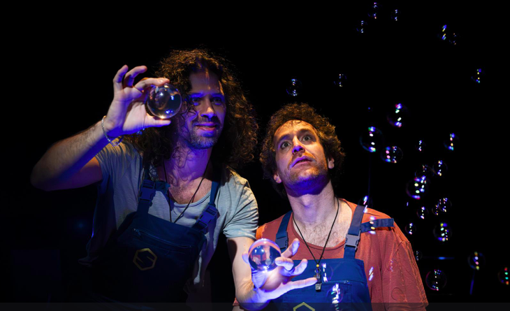 Le duo, costumé façon Super Mario modernes, jongle, danse, court, s’agite, improvise et joue avec elle. On les voit se débattre avec des bulles qui s’envolent, manipuler des bâtons lumineux, voltiger dans des effets visuels hypnotiques, et même créer de la musique à partir des objets du décor.