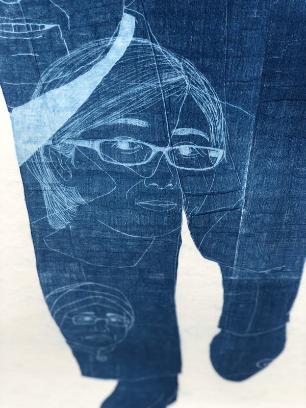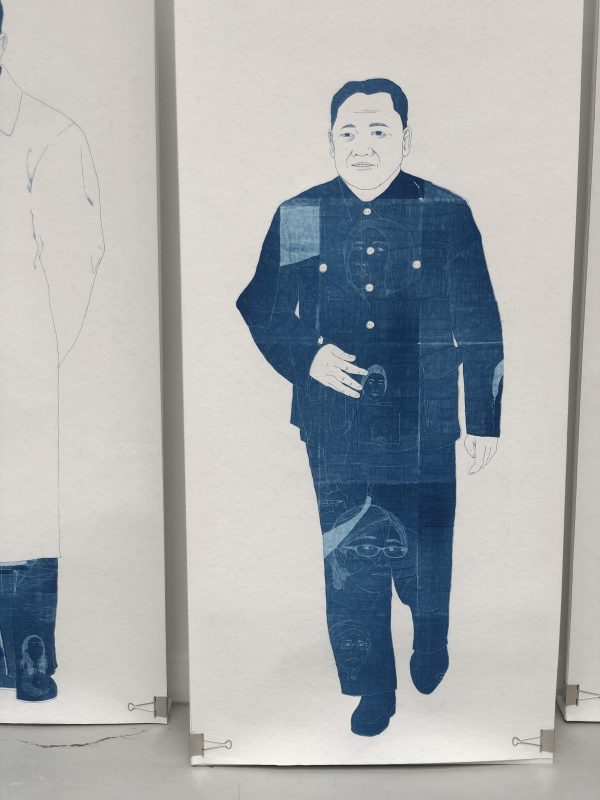 C’est cette même artiste qui a conçu ces « Hommes seuls » , une référence à la politique de l’enfant unique…leurs costumes bleus sont parsemés de visages de femmes influentes…