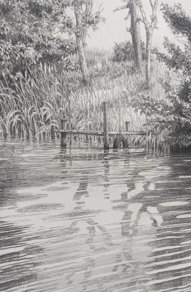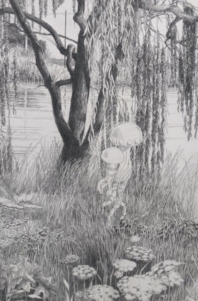L’artiste Gilles Marrey a entamé ce dessin, en déroulant la feuille de gauche vers la droite au fur et à mesure, sans schéma préconçu, sans idée arrêtée. Il se laissait porter par le courant du temps de ses pensées et de ses émotions. En raison de sa taille gigantesque, cette oeuvre n’a pu être vue en entier, y compris par l’artiste lui-même, qu’une fois exposée!