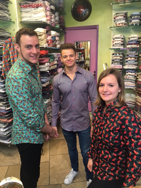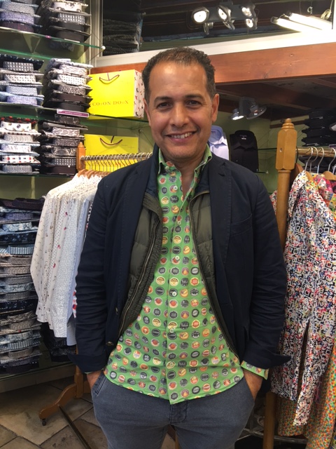 (En haut à gauche : Hassan Mennour – Medjoub directeur de Coton doux, photo du dessous l’une des graphistes pose gentiment avec l’un des vendeurs, photo de droite : Géraldine est cette fois entourée de deux vendeurs … tous portent les chemises aux imprimés de dingue !)