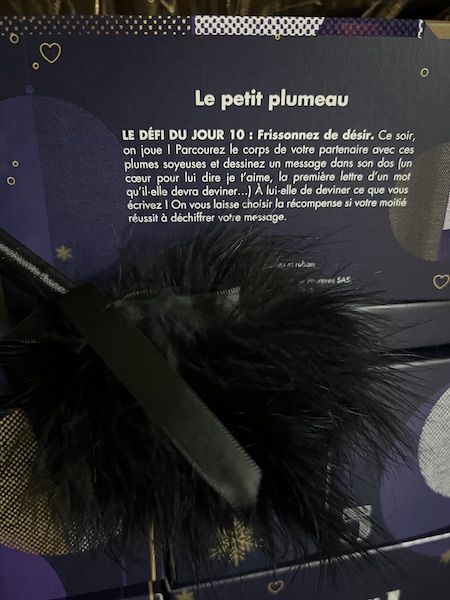 Ce calendrier, tout comme celui que j’ai reçu, regorge de surprises inspirantes qui pimenteront le quotidien des couples. À l’intérieur de ce sublime coffret, des cadeaux coquins, pour l’un ou l’autre des deux partenaires mais aussi pour les deux à la fois. Les 24 surprises sont toutes présentées dans un luxueux écrin pourpre et or, du plus bel effet.