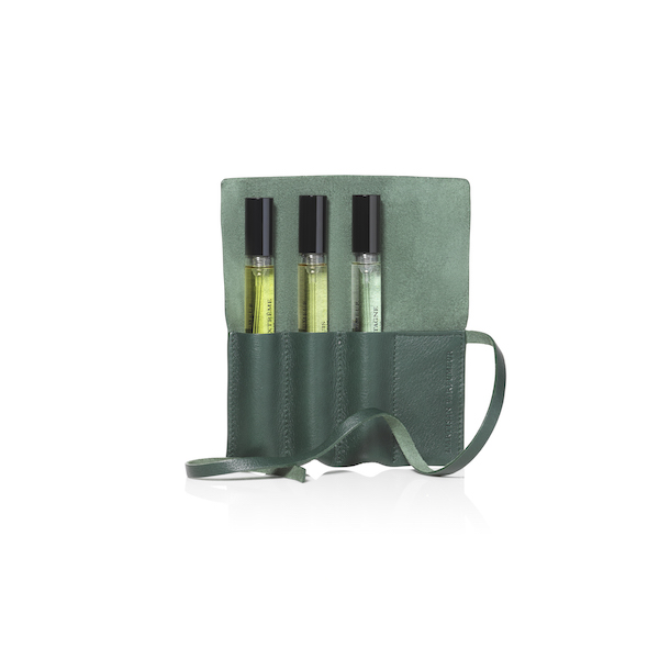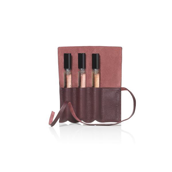 Prix : Etui en cuir (décliné en 6 couleurs et personnalisable d’initiales ou d’un message de votre choix) vendu avec 3 x 10ml – fragrances au choix = 98€