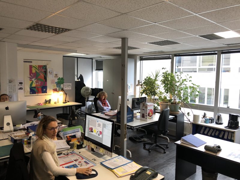 Plusieurs étages de bureaux spacieux où officient une cinquantaine de collaborateurs permanents: rédacteurs, acheteuses, chargés de la communication, du traitement des commandes ou du site web de Bleu Bonheur.
